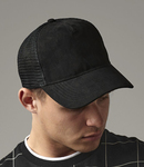 100% polyester suede. Polyester mesh rear panels. 5 panel. Structured front panels. Pre-curved peak. Snapback size adjuster. Tear out label.